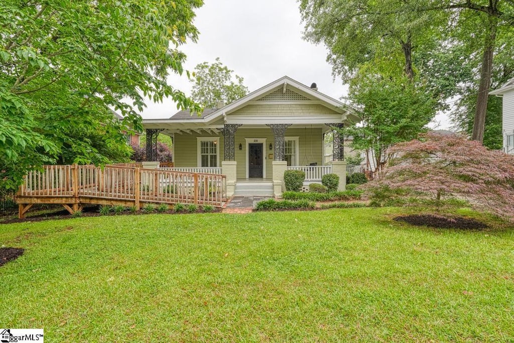 Charming bungalow living in the heart of Spartanburg! Located directly across from Converse College and just minutes from downtown, this 3 bedroom, 2 bathroom home blends classic charm with everyday convenience. Enjoy the spacious front porch—complete with a ramp for added accessibility—before stepping inside to a welcoming living room featuring a cozy gas log fireplace. The living room flows seamlessly into the bright and airy dining room, highlighted by large windows that fill the space with natural light. The primary suite features its own full bathroom with a walk-in shower, while the additional bedrooms are ideal for family, guests, or a home office setup. A second full bathroom adds everyday convenience. The kitchen features solid surface countertops and leads to a generous back deck, perfect for entertaining or relaxing. The fenced-in backyard includes a powered shed, offering plenty of space for storage, hobbies, or a workshop. An unfinished basement provides even more storage space and potential. Don’t miss your opportunity to own this well-loved home in one of Spartanburg’s most walkable and vibrant areas!