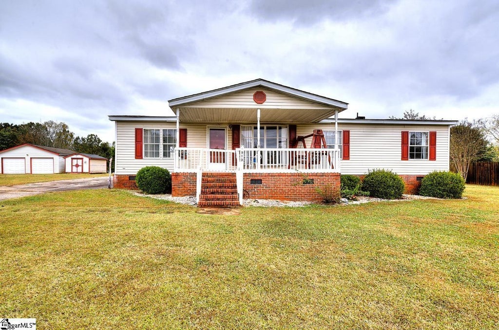 Well-maintained, comfortable doublewide on a lovely level .63 acre lot in Powdersville Estates. Easy one-level living. Primary bedroom features walk in closet and full bathroom with garden tub and separate shower. Wood burning fireplace in family room. All appliances convey. 2 sheds and 2 carports for storage and parking. Enjoy the front and back porches.